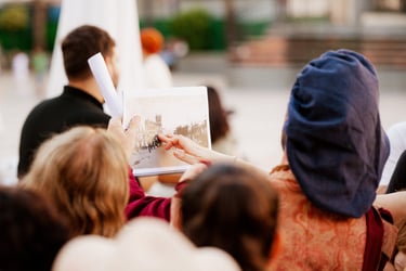 Evening group tour amid softly lit ruins, sharing stories of the past.
